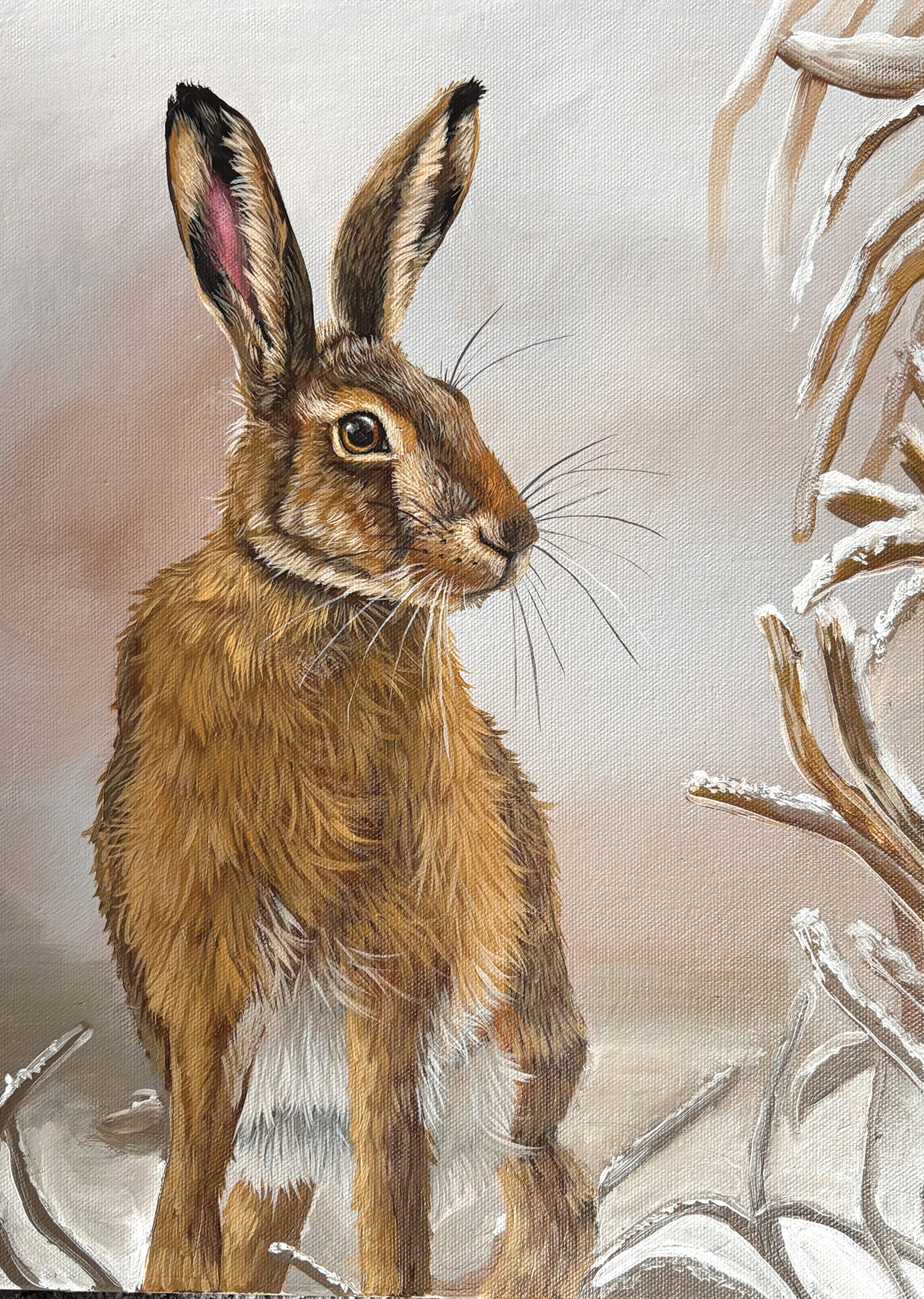 Original 'Morning Frost' Hare painting, rendered in acrylic paint onto an A3 stretched canvas.